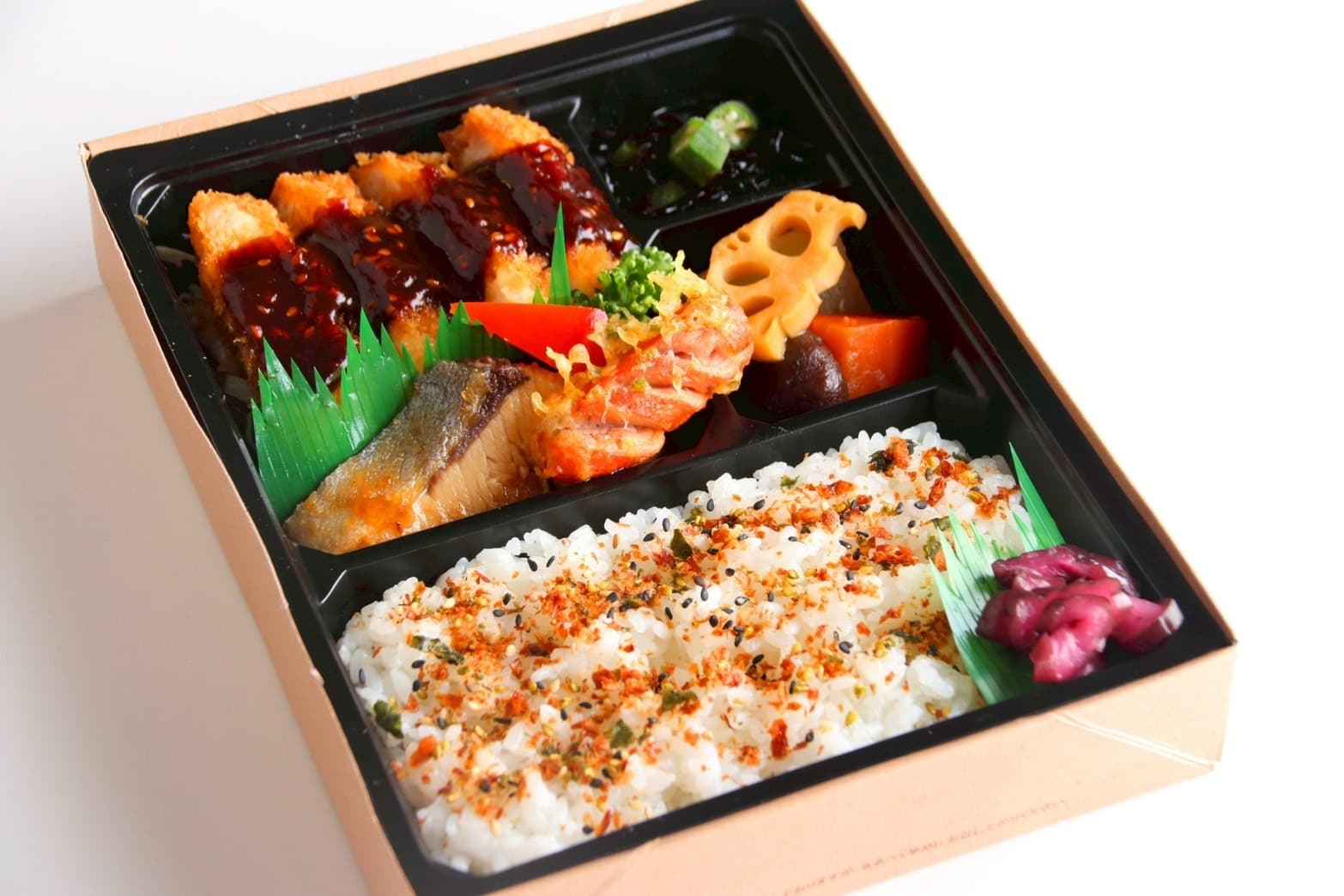 ■弁当内容:鰹節おかかごはん200g、豚ロース味噌カツ、鰤の照焼き、ウィンナー天、オクラ昆布、蓮根煮、玉子焼き、和惣菜