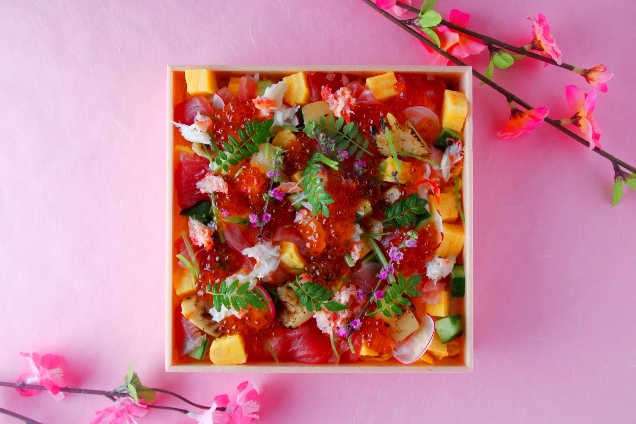 桃の節句に相応しい彩りにキングサーモンやマグロ、健やかな成長を願ういくらや海老を敷き詰めました。