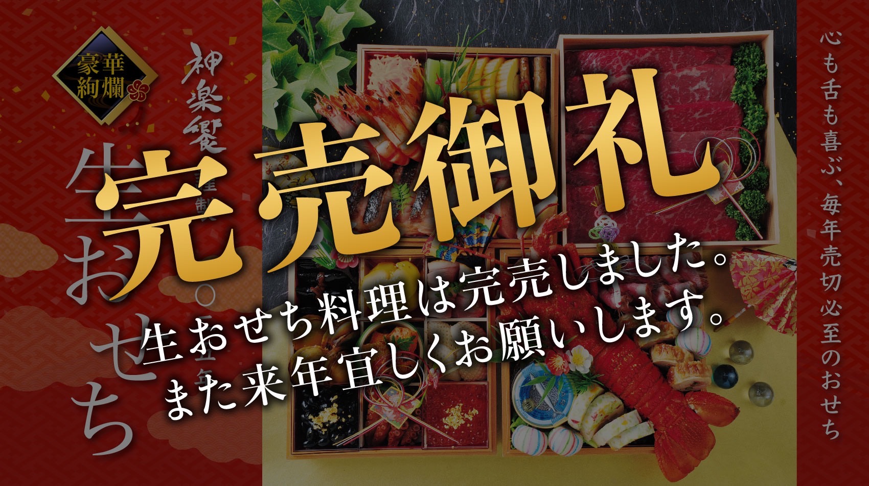 新年を迎えるのにふさわしい華やかなおせち料理。昨年から内容をグレードアップ。ロブスターや尾張牛ローストビーフ、低温熟 成魚が盛り込まれた絢爛豪華な生おせち料理。豪華3段重箱で神楽饗の伝統料理と手作りの味わいをお楽しみください。
